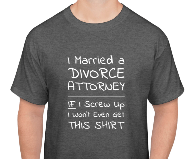 After 10 years of sacrifice, while we focused on the building of a solo family law firm, I designed a light hearted shirt based on the worn out joke I heard so often. I never imagined it would actually come true.